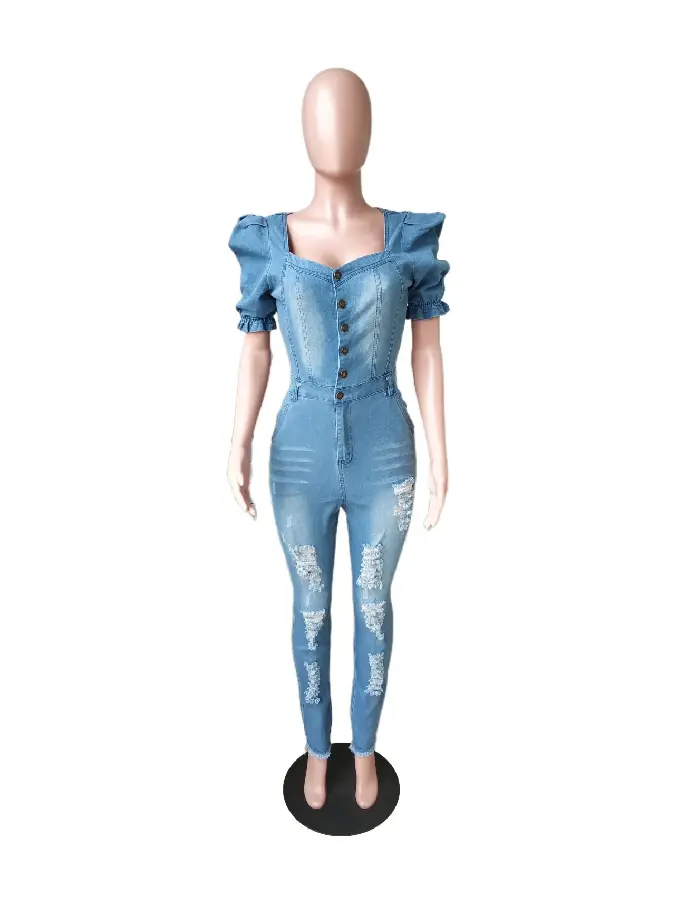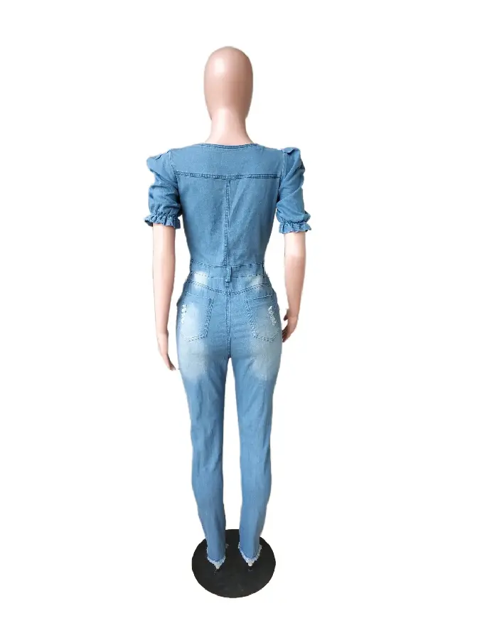 Casual Puff Sleeve Denim Jet White Ripped Jumpsuit