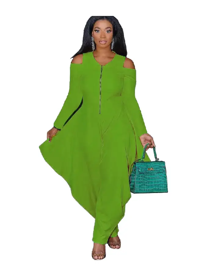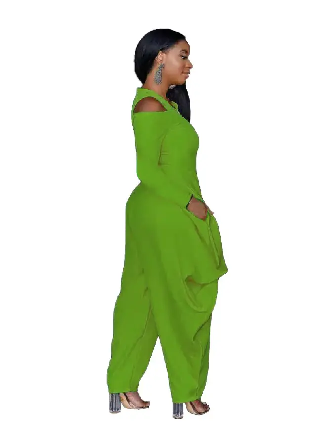 Refresh your wardrobe with the vibrant and stylish Solid Color Green Cold Shoulder Loose Hem Jumpsuit. This eye-catching piece combines bold color with contemporary design, offering a chic and relaxed look that’s perfect for any occasion.