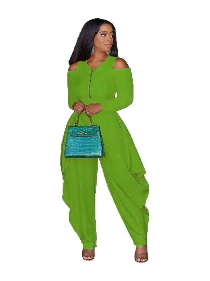 Solid Color Green Cold Shoulder Loose Hem Jumpsuit