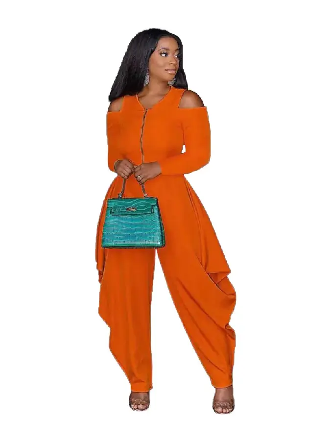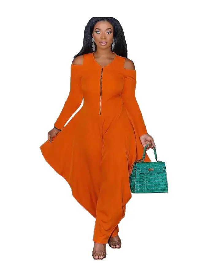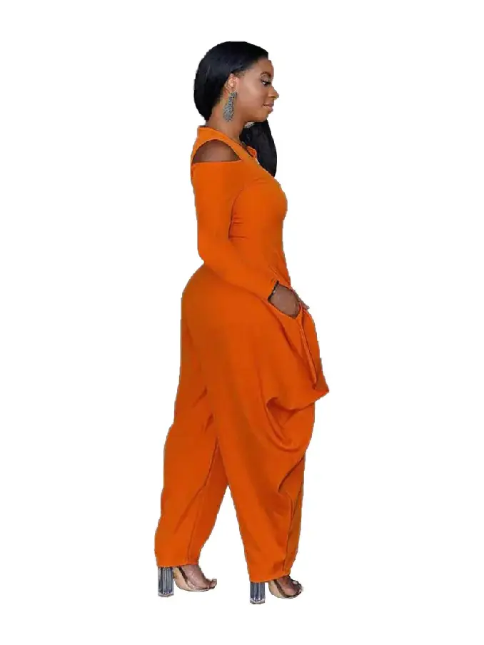 Solid Color Orange Cold Shoulder Loose Hem Jumpsuit