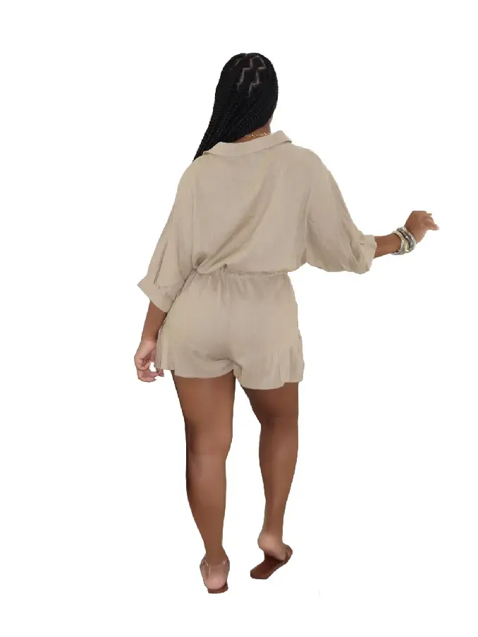 Solid Color Beige Convertible Collar Ruffled Short Romper