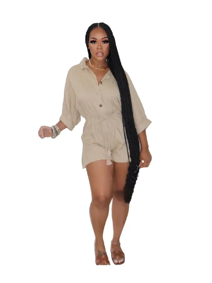 Elevate your casual wardrobe with our Solid Color Beige Convertible Collar Ruffled Short Romper—a perfect blend of playful and polished. This versatile romper combines a soft beige hue with chic details, making it an ideal choice for a variety of occasions.