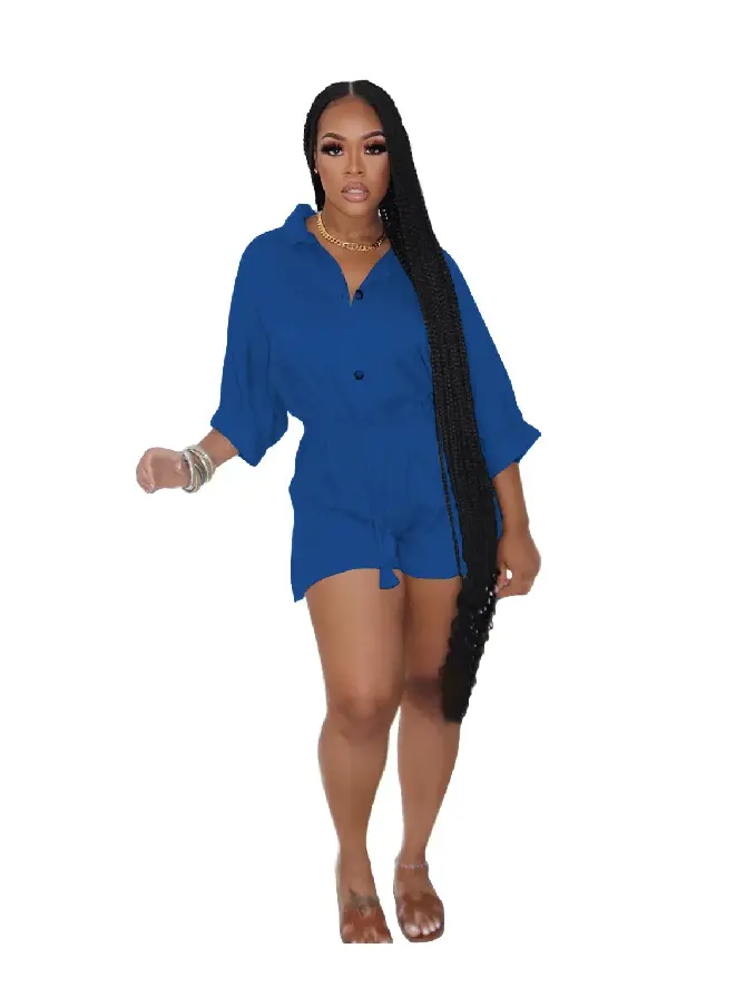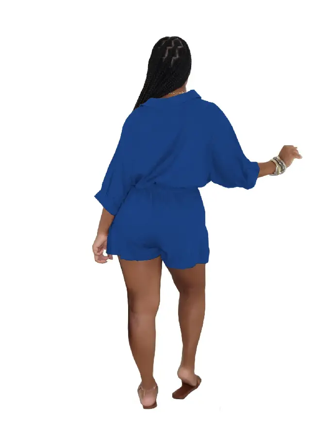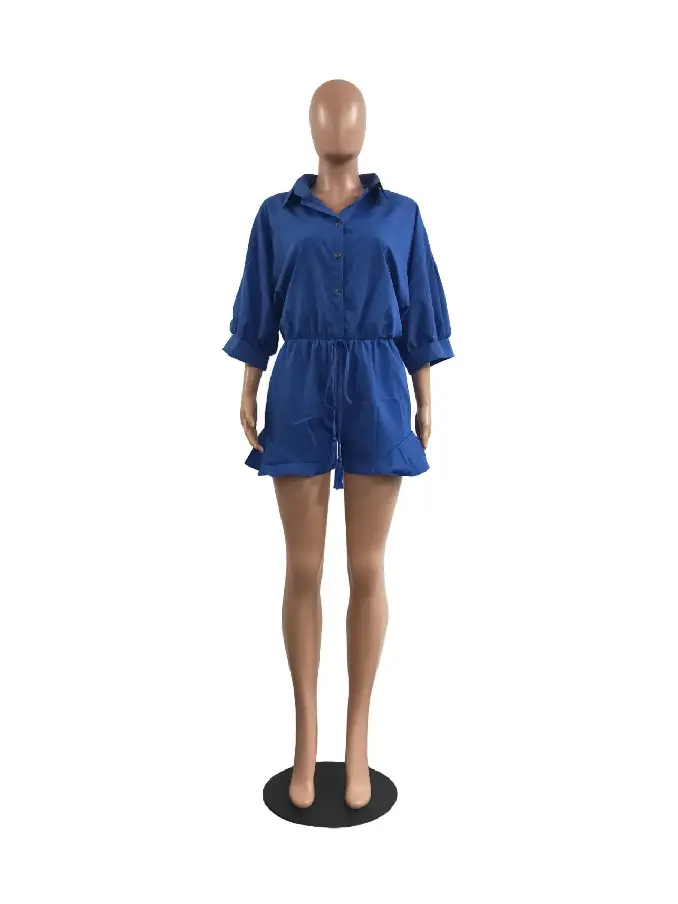 Solid Color Blue Convertible Collar Ruffled Blue Short Romper