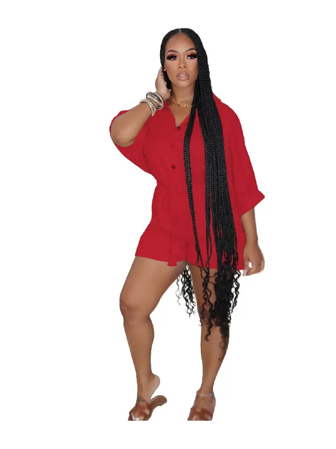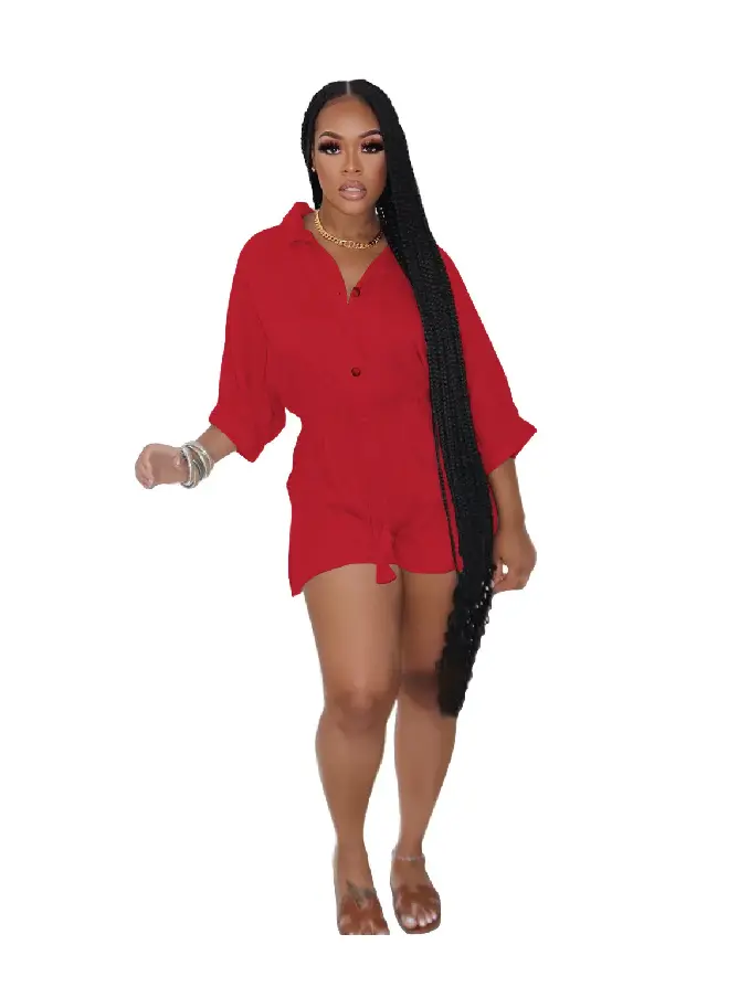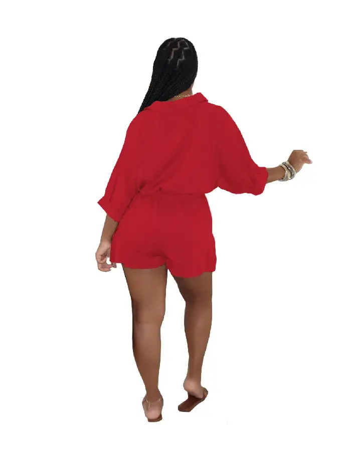 Solid Color Red Convertible Collar Ruffled Red Short Romper