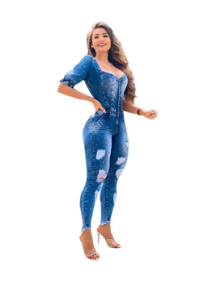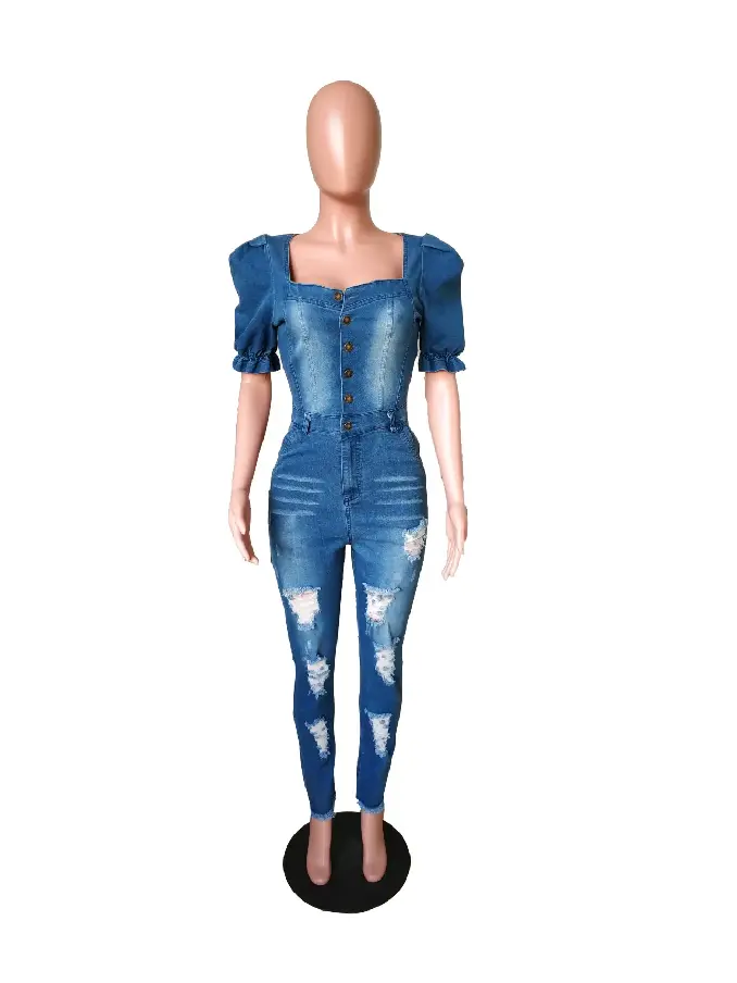 Refresh your wardrobe with a touch of contemporary charm and timeless style in our Casual Puff Sleeve Denim Jet White Ripped Jumpsuit. This standout piece seamlessly blends classic denim with modern, playful details, making it perfect for a variety of casual occasions.