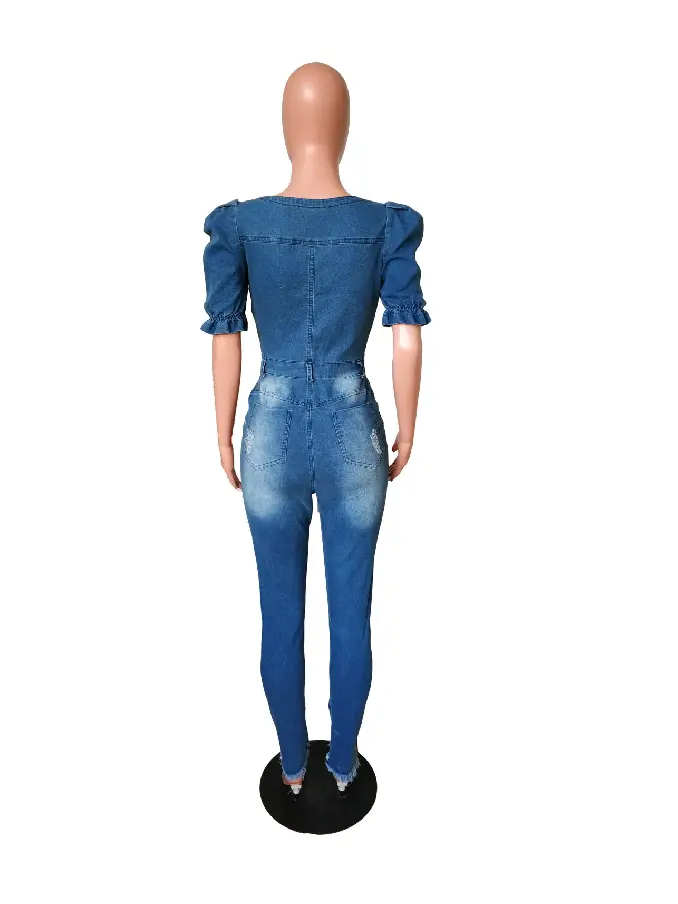 Casual Puff Sleeve Denim Jet White Ripped Jumpsuit
