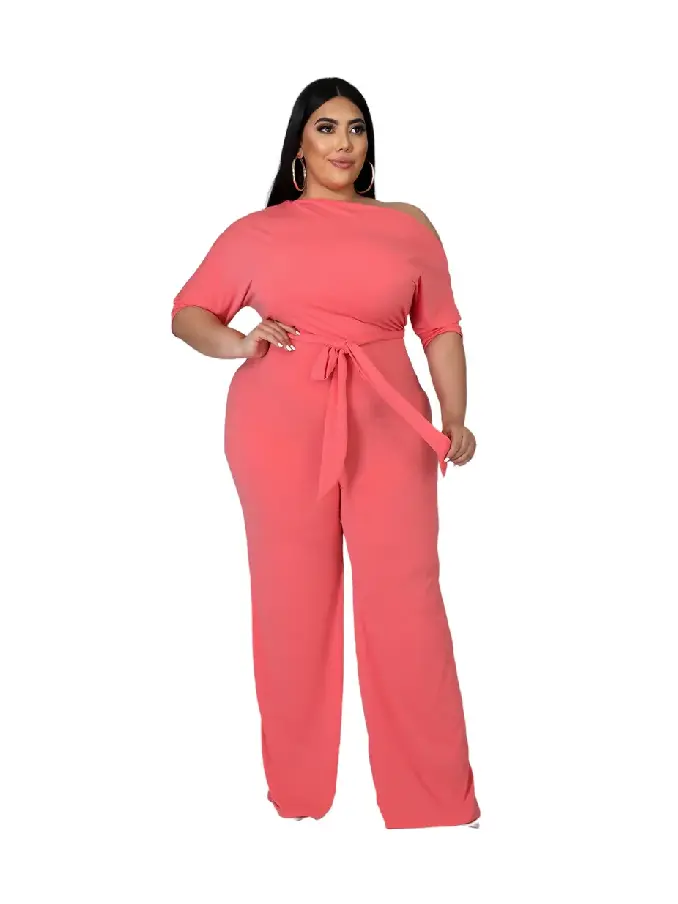 Solid Color Bandage Oblique Shoulder Flared Rose Jumpsuit.