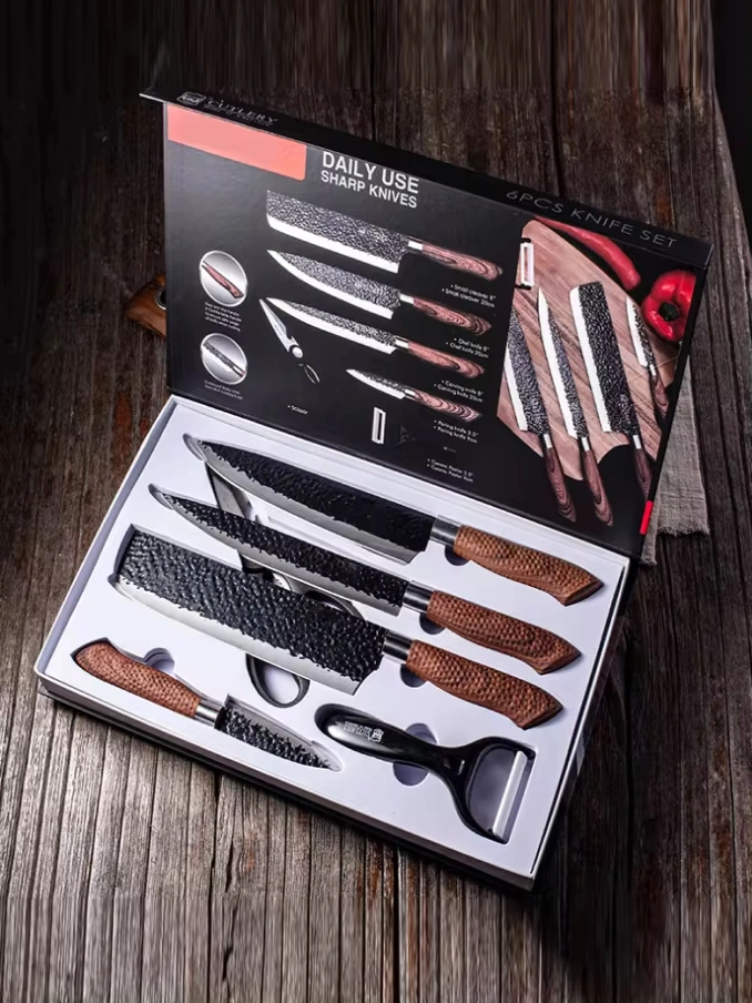 6-piece Stainless Steel Kitchen Knife Set, a must-have for every culinary enthusiast and professional chef seeking precision, durability, and style in their kitchen arsenal. This comprehensive set is meticulously crafted to meet all your culinary needs, ensuring effortless slicing, dicing, and chopping with every use.