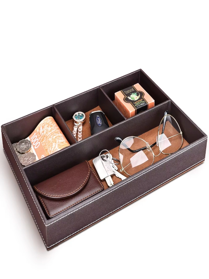 The GORESE Wooden Storage Tray is a versatile office organizer. Made from leather, it features a rectangular shape and a standing-type installation. The tray measures 30*20*4.3 cm and is designed for storing sundries, specifically as a jewelry storage tray. Packaged in a carton, this leather wooden storage tray is a practical and stylish addition to any office or home.