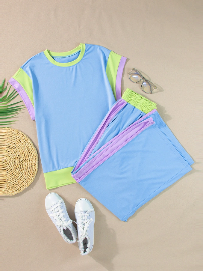 Sky Blue Color Block Detail Casual Two-piece Outfit